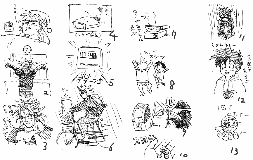 わりにくいとこだと、6で学校へ、7は部室での自主制作、8で友人と部活帰りに回転寿司チェーンへ、9でガシャポン発見ですね。里志の活動範囲ではなかなかブロリーが含まれるガシャポンは見つからないのですが、寿司屋で見つけてビビりましたww