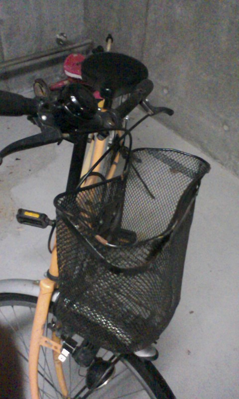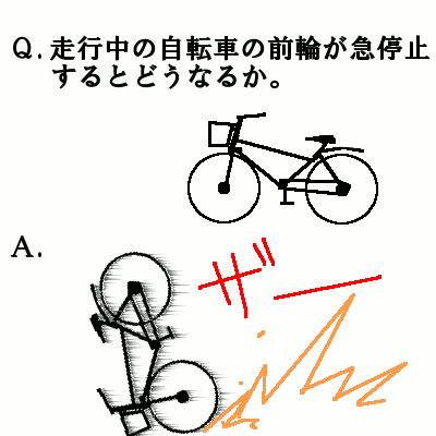 右足前輪に巻き込まれる→前輪停止→チャリの尻が上がる→必然的に下方へ傾いたカゴが地面に当たって衝撃を吸収すると同時に、ハンマーの要領で地面に里志 激☆突 →カゴでバウンドして軽く舞い上がっていた自転車が里志に覆いかぶさる→痛!