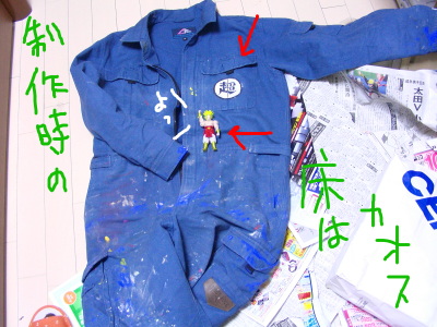 熱いとろろが里志の元に到達したので熱い気が高まって溢れてつなぎに写真のようなマークが現れるほどでした。(解説:ふと思い立ってつなぎに唐突に「超」文字を書いた里志だったが、後にブログを確認し、その衝動がテンさんによる熱いとろろが受信されたことによるものであると知ったのだった!)