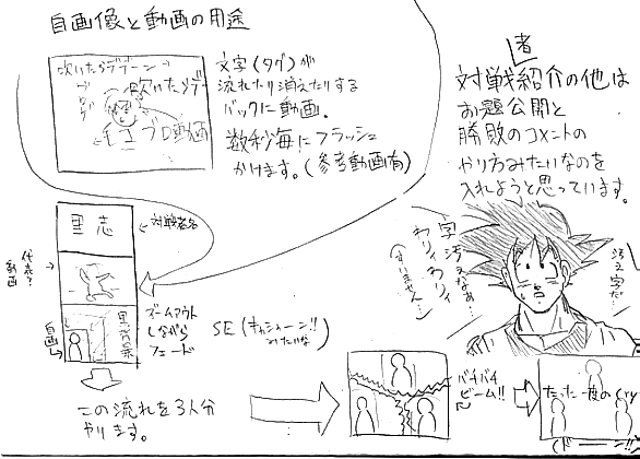 それと、「対戦するのはこんな動画の作者だよ」という感じで、各人3つくらいの動画を、それぞれ数秒くらいずつ使わせていただきたいなぁ…使わせていただけるといいなぁ…と思っています。